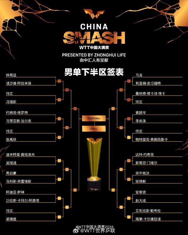 继新加坡、沙特之后,今年第三站WTT大满贯赛事中国大满贯首度落户北京,9月27日下午,正赛抽签仪式在首钢国际会展中心举行。男单头号种子王楚钦和年轻队友林诗栋、向鹏同在上半区,巴黎奥运会后首次亮相赛场的马龙和梁靖崑、林高远等人同在下半区,大家将在主场迎来包括卡尔德拉诺、莫雷加德、张本智和等外协会名将的冲击。